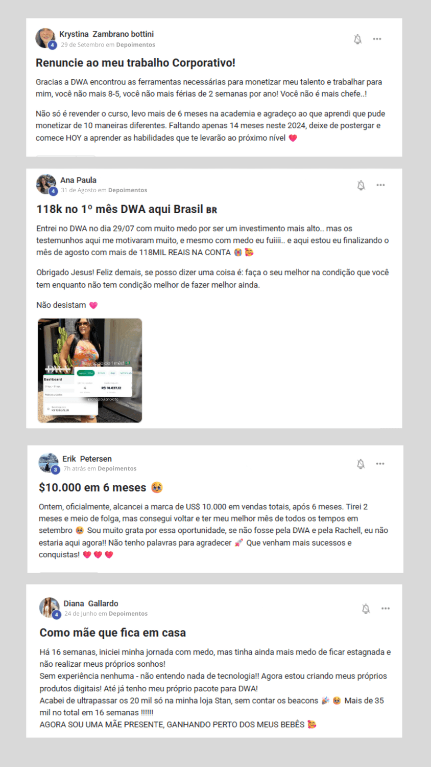 Entendo você! Eu mesma comprei 10 cursos antes do DWA e não consegui resultados. O que torna o DWA diferente é o método estruturado e o foco em desenvolver as habilidades práticas que você precisa para construir um negócio digital de verdade.
