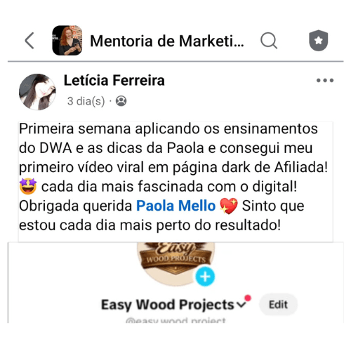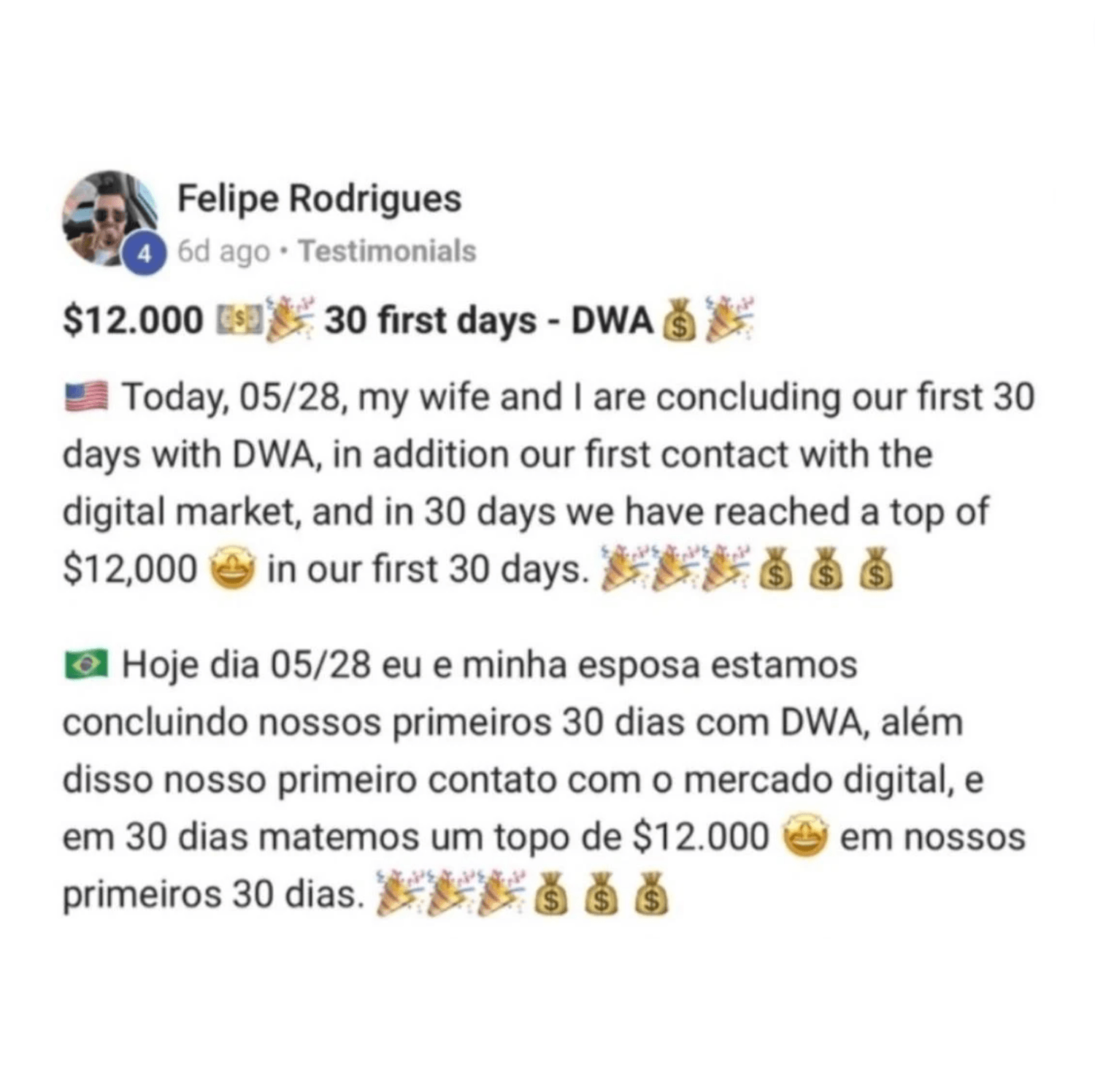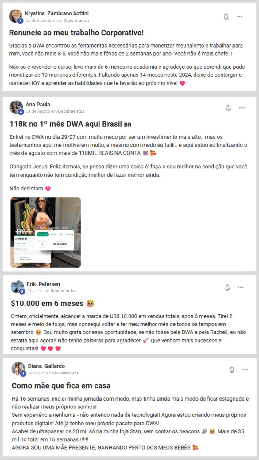 Antes do DWA eu já tinha tentado muitas coisas na internet como Avaliar anúncios, Responder Pesquisas, Trading, Prestadora de serviços, mas nenhum deles trouxe sucesso, inclusive eu perdi muito dinheiro e muito dinheiro nas minhas tentativas. Foi quando, já desanimada com os custos crescentes e os cursos infrutíferos, decidi me dar uma última chance e ingressar na Digital Wealth Academy.