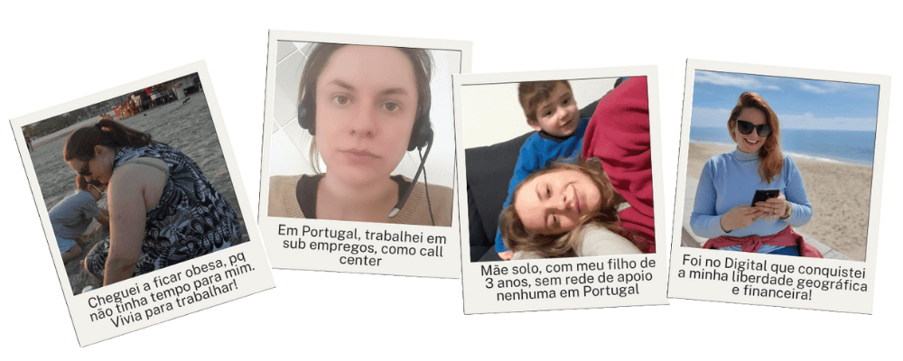 Foi no auge do cansaço e desespero que iniciei no marketing digital. Eu me separei e fiquei completamente sozinha em Portugal, somente eu e meu filho de 3 anos. Sem qualquer rede de apoio. Eu não conseguia conciliar os horários do trabalho com os horários da escola, e muito menos conseguiria pagar minhas contas apenas com o salário do call center. Foi desesperador! No começo, eu duvidei, achei que a internet era coisa de gente expert, blogueira e que isso não era pra mim.